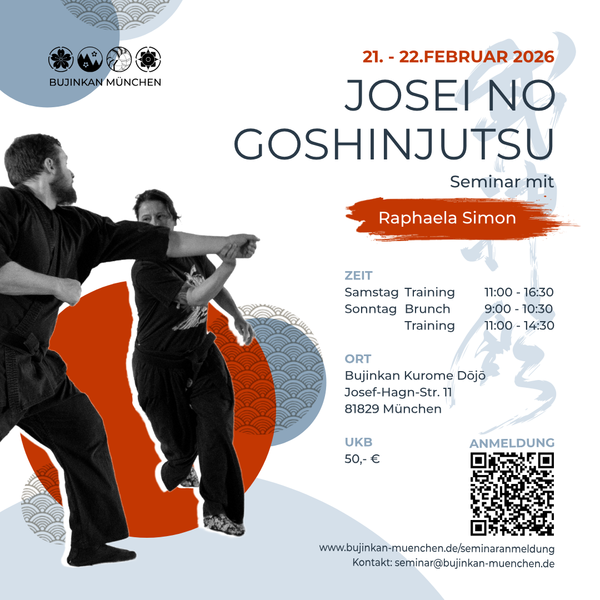 Anmeldung unter: https://www.bujinkan-muenchen.de/post/seminarankündigung-raphaela-simon-josei-no-goshinjutsu