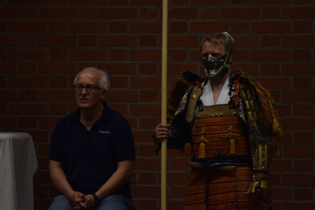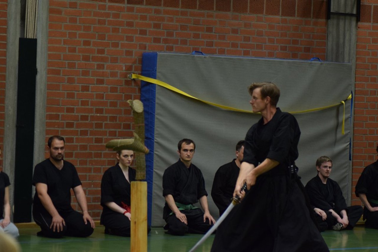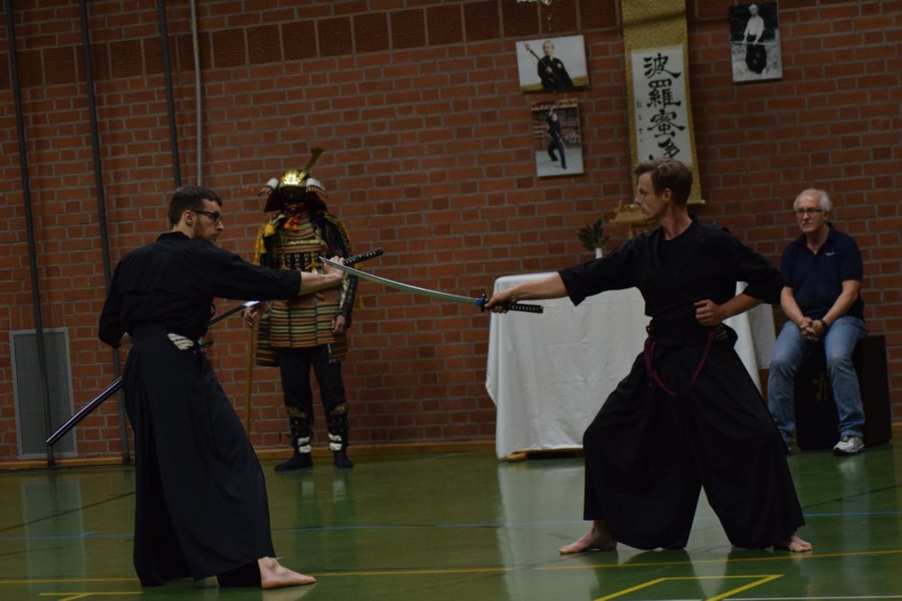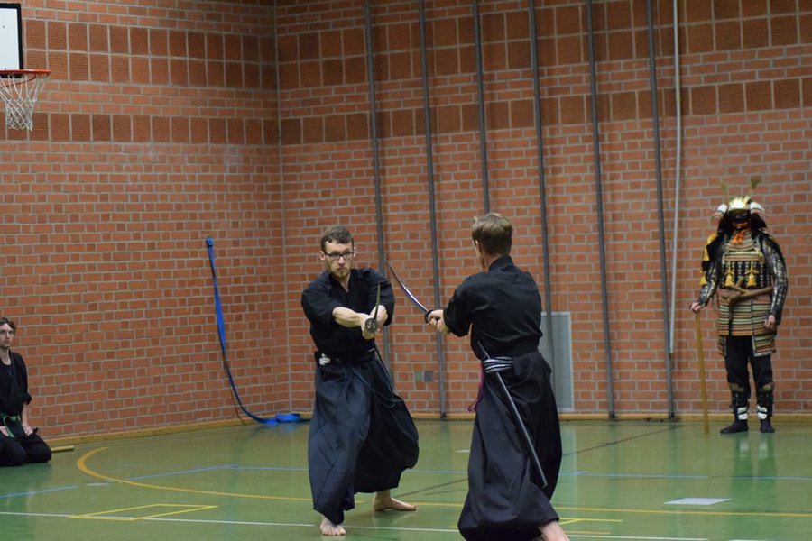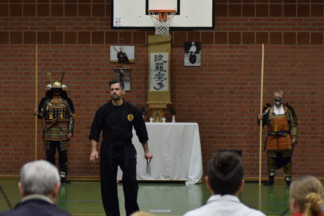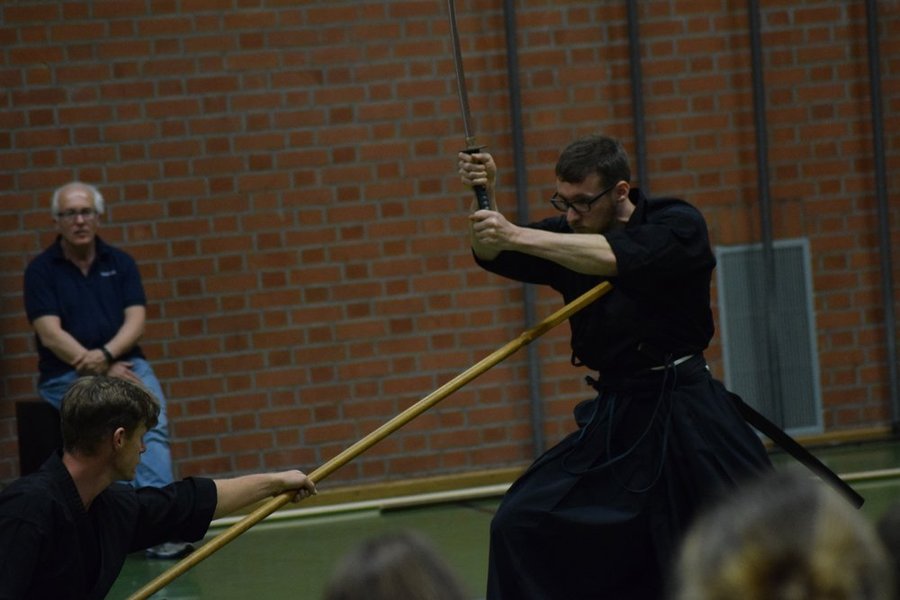 Den dritten Abschnitt bildete ein kurzer Einblick in das Waffentraining durch Formen mit dem japanischen Schwert (Katana und Tachi), dem Speer (Yari), der Hellebarde (Naginata) sowie kurzen und langen Stöcken (Hanbo und Bo).