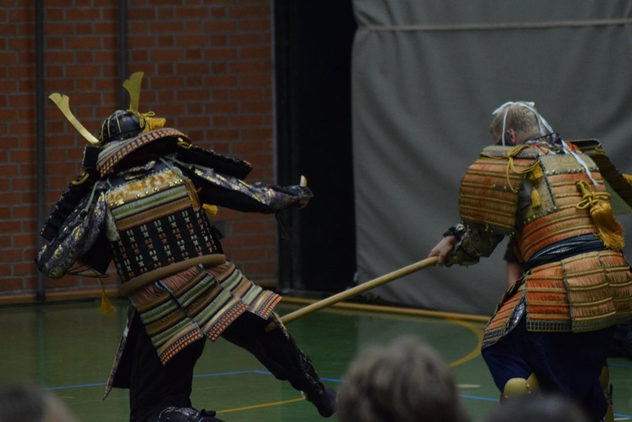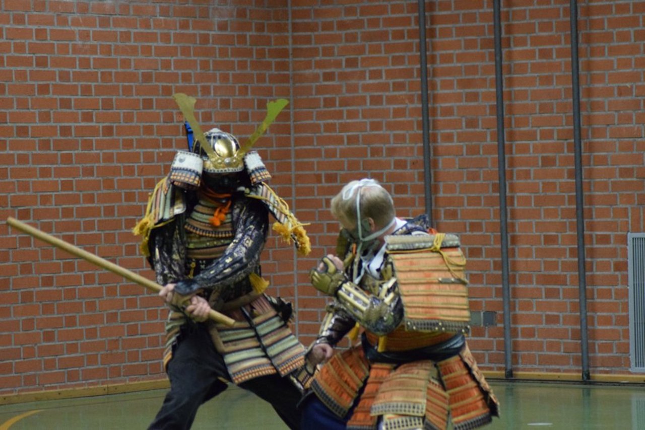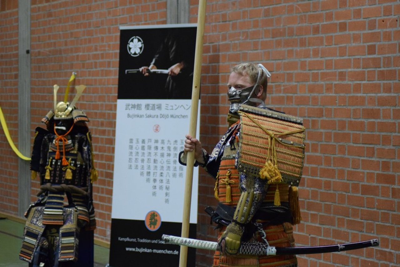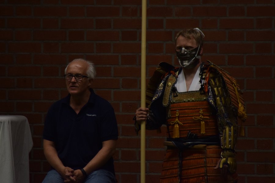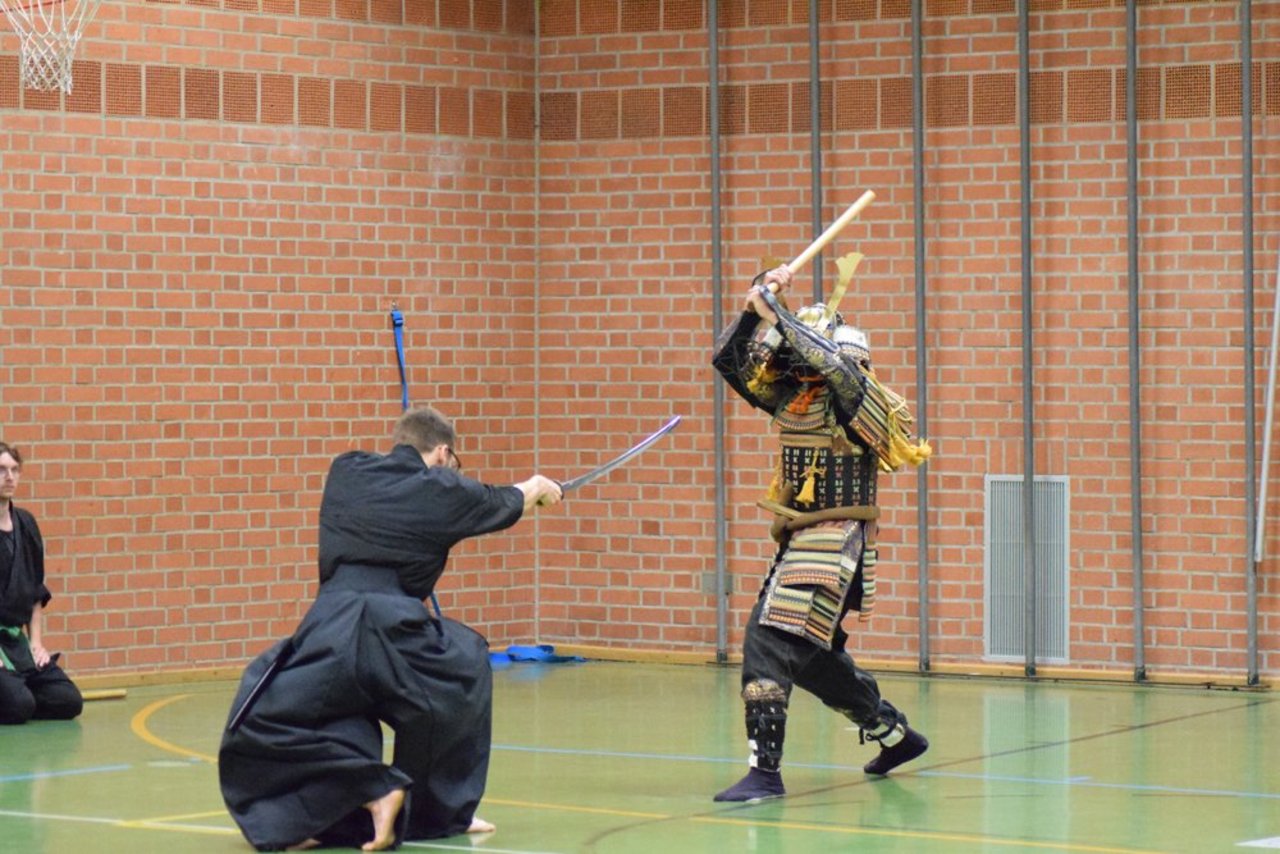 Den dritten Abschnitt bildete ein kurzer Einblick in das Waffentraining durch Formen mit dem japanischen Schwert (Katana und Tachi), dem Speer (Yari), der Hellebarde (Naginata) sowie kurzen und langen Stöcken (Hanbo und Bo).
